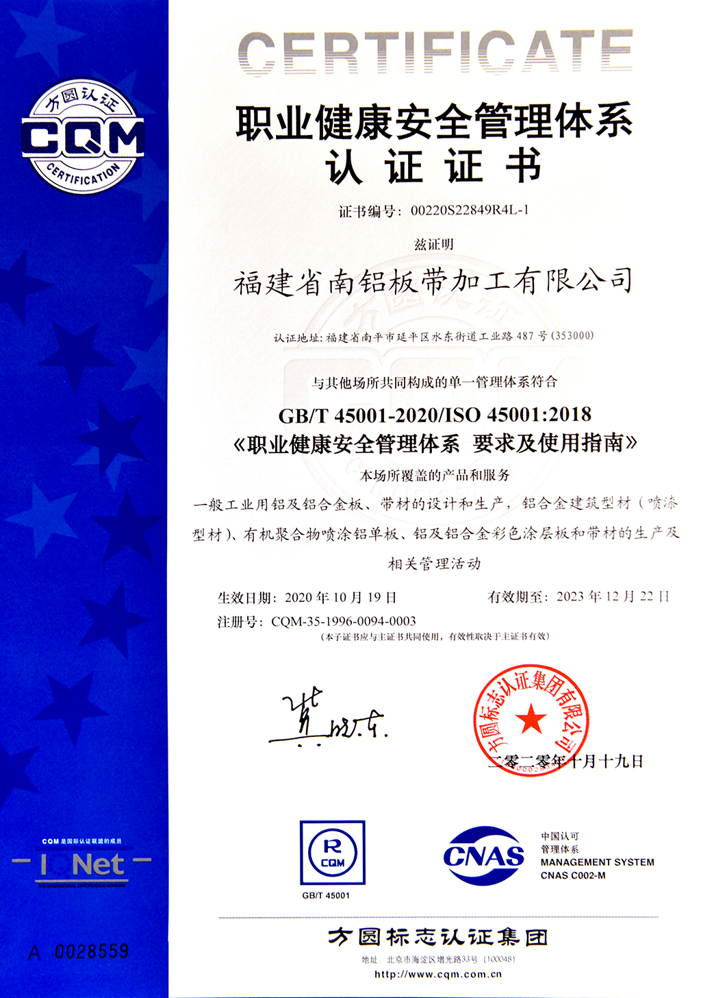 职业健康安全管理体系认证证书--南铝板带