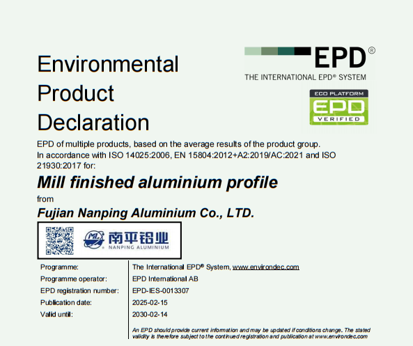 南平铝业建筑铝型材全系主导产品获国际EPD认证